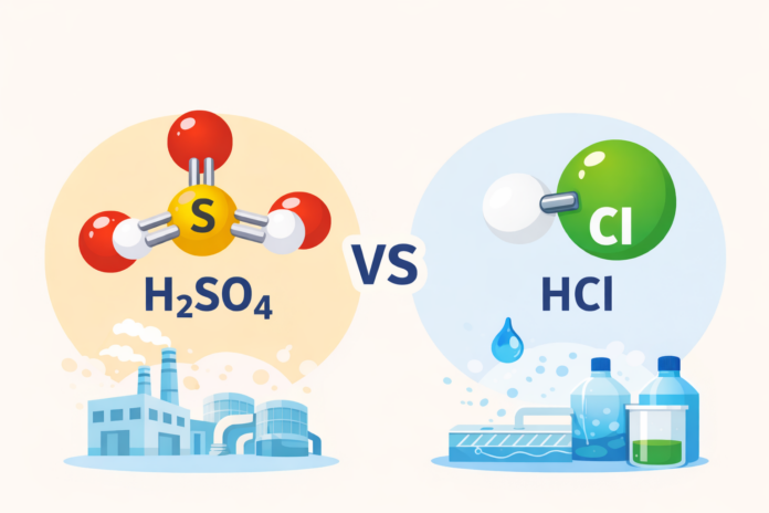 Универсальных кислот не существует, поэтому выбор напрямую зависит от характера выполняемых задач. Серная кислота — это стабильность и низкая летучесть, но повышенная опасность при разбавлении. Соляная кислота отличается быстрым действием и высокой эффективностью, но нужно опасаться испарений и коррозии.